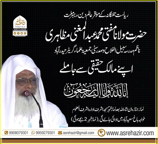 استاذ محترم حضرت مولانا مفتی عبدالمغنی مظاہری علیہ الرحمۃ کی تھی جو طویل علالت کے بعد آج رات 18/اگسٹ 2021 مطابق 8/محرم الحرام 1443 بروز چہارشنبہ رات تین بجے