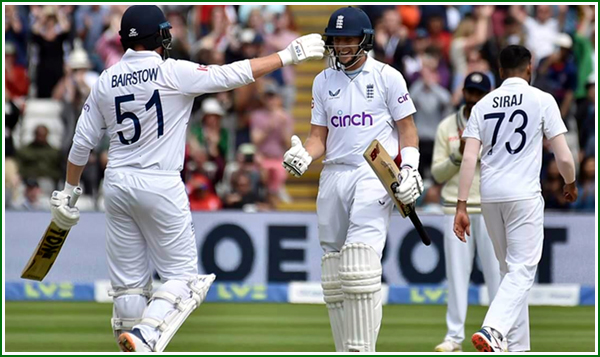 بھارت کا 15 سال بعد انگلینڈ میں ٹیسٹ سیریز جیتنے کا خواب چکنا چور ہو گیا۔ برمنگھم ٹیسٹ میں انگلینڈ نے ٹیم انڈیا کو 7 وکٹوں سے شکست دے دی۔ انگلینڈ نے شاندار فارم میں موجود جو روٹ (142*) اور جونی بیرسٹو (114*) کے درمیان چوتھی وکٹ کے لیے 269 رنز کی شراکت کی بدولت 378 رنز کا ہدف تین وکٹوں کے نقصان پر حاصل کر لیا۔ اس کے ساتھ ہی پانچ ٹیسٹ میچوں کی سیریز 2-2 سے برابر ہوگئی ہے۔