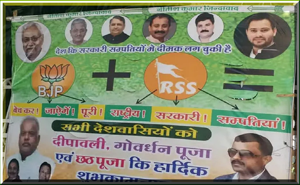 پوسٹر کے اوپری حصے میں بہار کے وزیر اعلی نتیش کمار اور نائب وزیر اعلی تیجسوی یادو کے ساتھ دیگر وزراء کی تصویر ہے۔ نیچے لکھا ہے کہ بی جے پی اور آر ایس ایس ‘پوری قومی حکومت کے اثاثے بیچ دیں گے’۔