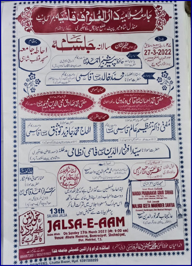 جامعہ اسلامیہ دارالعلوم فرقانیہ بمراس پیٹ،منڈل شاہ میر پیٹ ضلع میڑچل ملکاجگری،حیدرآباد کا سالانہ تیرہواں عظیم الشان اجلاس عام،27 مارچ بروز اتوار صبح نوبجے احاطہ جامعہ میں منعقد ہوگا،حضرت مولانا حافظ پیر شبیر احمد صاحب صدر جمعیة علماء تلنگانہ وآندھرا پردیش اجلاس کی سرپرستی اور مولانا محمد خالد قاسمی صاحب صدرالمدرسین مدرسہ عربیہ سراج العلوم حشمت پیٹ سکندرآباد صدارت فرمائیں گے،