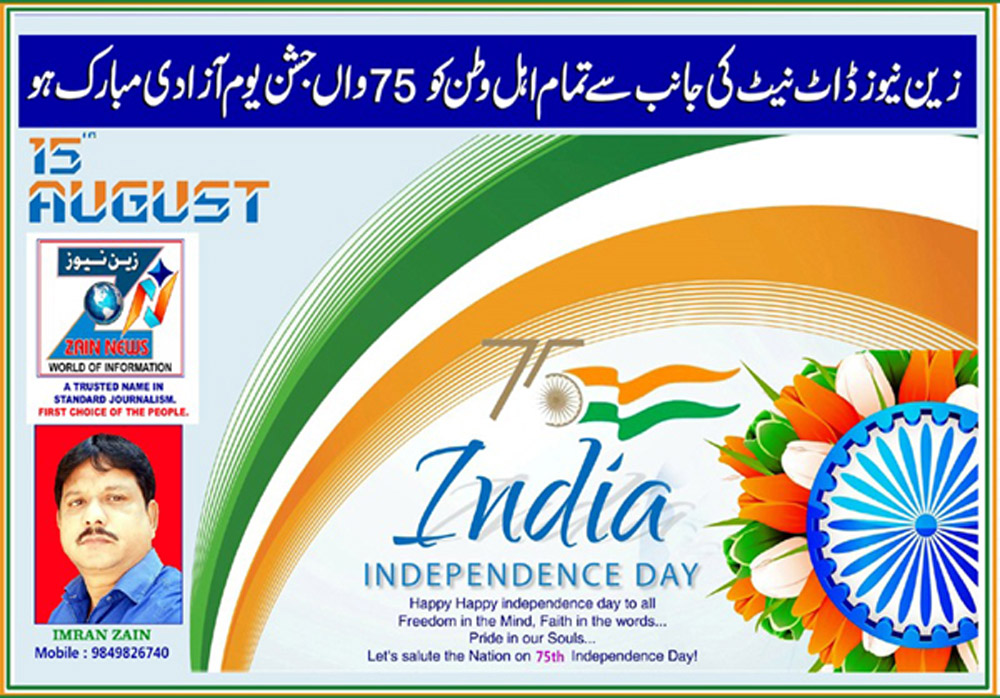 اس سال ہم آزادی کی ڈائمنڈ جوبلی منا رہے ہیں خوشی کے اس پُر مسرت موقع پر زین نیوزاُردو نیوز پورٹل کی جانب سے تمام اہل وطن اور زین نیوز کے قارئین کو 75 واں یوم جشن آزادی مبارکباد پیش کی جاتی ہے۔ ملک کی آزادی کے لئے جس طرح سب نے مل کر جدوجہد کی اور ہندوستان کو آزاد کرایا ہے۔ اسی طرح سب مل کر اس ملک کے آئین کی حفاظت کریں گے۔