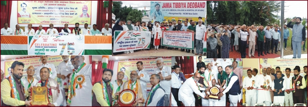 دیوبند یونانی میڈیکل کالج اسپتال اور ریسرچ سینٹر میں بھی یوم آزادی جوش وخروش کے ساتھ منائی گئی ۔ پرچم کشائی ادارہ کے منیجر پروفیسر ڈاکٹر قمر الزماں قریشی نے کی۔ اس موقع پر ڈاکٹر قمرالزماں قریشی نے کہا کہ وزیر اعظم نریندر مودی اور وزارت آیوش کے مطابق دیوبند یونانی میڈیکل کالج گزشتہ اگست 2021سے لے کر اب اگست 2022تک آزادی کے امرت مہا اتسو کو منارہا ہے اور اس مہم میں دیہی علاقوں میں ہر گھر ترنگا، سوچھ بھارت، صحت مند ہندوستان اور آیوش پیتھی کو بڑھاوا دینے کی مہم میں بڑھ چڑھ کر حصہ لے رہاہے۔