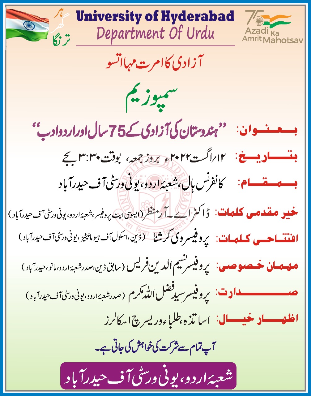 ڈاکٹر سید فضل اللہ مکرم‘ پروفیسر اینڈ ہیڈ ‘ شعبہ اُردو سینٹرل یونیورسٹی آف حیدرآباد کے بموجب ‘شعبہ اردو یونیورسٹی آف حیدرآباد کے زیر اہتمام آزادی کا امرت مہا اتسو اور ہر گھر ترنگا کے ضمن میں ایک سمپوزیم بعنوان "ہندوستان کی آزادی کے ۷۵ سال اور اردو ادب ” بروز جمعہ ۳۰۔۳ بجے بمقام کانفرنس ہال شعبہ اردو میں انعقاد عمل میں آرہا ہے ۔