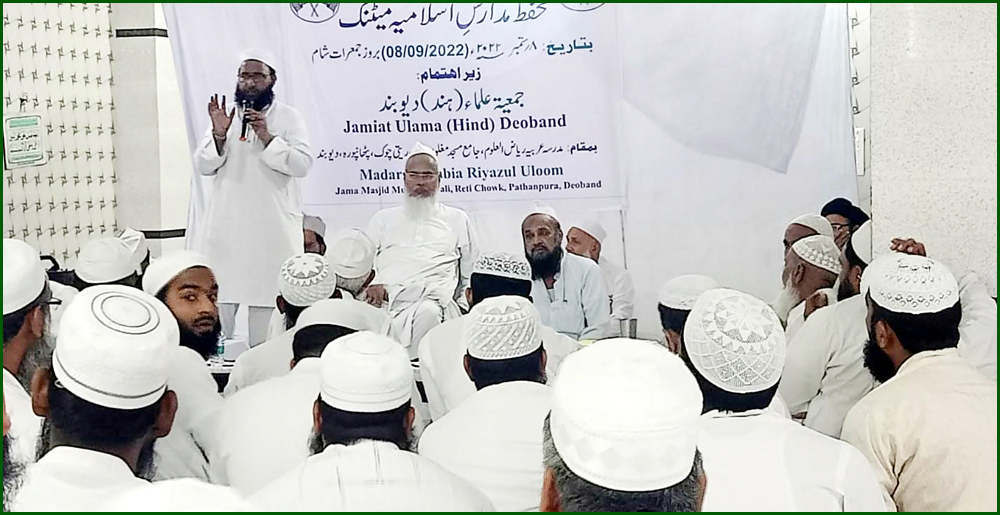 لہٰذا اپنے ملک کی ترقی کی کوشش کے لیے اور مذہب اسلام کو روشن کرنے کے لیے مدارس اسلامیہ کا اچھی حالت میں باقی رکھنا حکومت ہند اور علمائے کرام کی جماعت کی اہم ذمہ داری ہے۔ میٹنگ کی صدارت مولانا مفتی امجد مدنی نے کی اور نظامت مولانا مفتی خادم حسین قاسمی آرگنائزر جمعیۃ علماء ہند (دیوبند) نے انجام دی۔