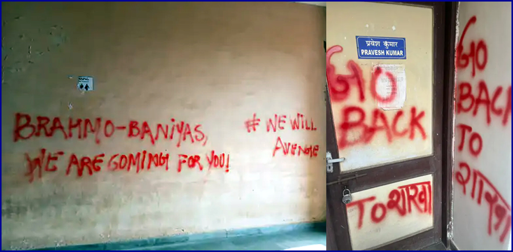 خبر رساں ایجنسی کی رپورٹ کے مطابق دیواروں پر کچھ نعرے تحر یر کیے گئے ہیں "برہمن کیمپس چھوڑ دیں”، "وہاں خون ہو گا”، "برہمن بھارت چھوڑدو” اور "برہمنو بنیا، ہم تمہارے لیے آ رہے ہیں! ہم بدلہ لیں گے”۔