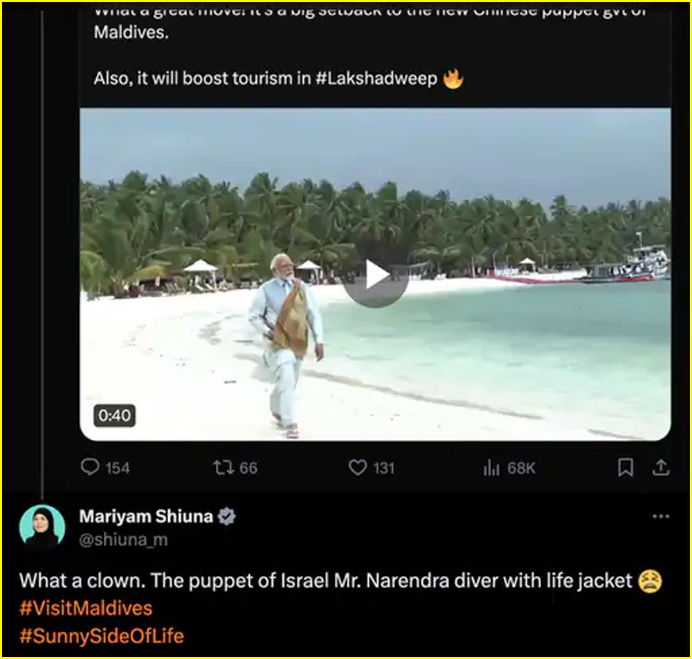 مالدیپ کی وزیر نے پی ایم مودی کے خلاف قابل اعتراض الفاظ کا استعمال کیا۔وزیرمریم شیونا نے سوشل میڈیا پر ایک پوسٹ میں پی ایم مودی کے لیے قابل اعتراض الفاظ کا استعمال کیا۔