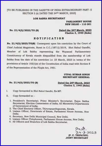 کانگریس کے رکن پارلیمنٹ راہول گاندھی، جنہیں مودی سرنام کے تمام لوگ چور ہونے پر تبصرہ کرنے پر دو سال کے لیے جیل بھیج دیا گیا تھا، کو نااہل قرار دے دیا گیا ہے راہول گاندھی اب رکن پارلیمنٹ نہیں ہیں۔ جمعہ کو لوک سبھا سکریٹریٹ نے اس کا نوٹیفکیشن جاری کیا۔ انہیں آئین کے آرٹیکل 102(1) اور ‘عوامی نمائندگی ایکٹ 1951’ کے سیکشن 8 کے تحت پارلیمنٹ کی رکنیت سے نااہل قرار دیا گیا ہے۔ وہ کیرالہ کے وایناڈ سے لوک سبھا کے رکن تھے۔ لوک سبھا سکریٹریٹ سے ایک خط جاری کرکے اس کی جانکاری دی گئی ہے