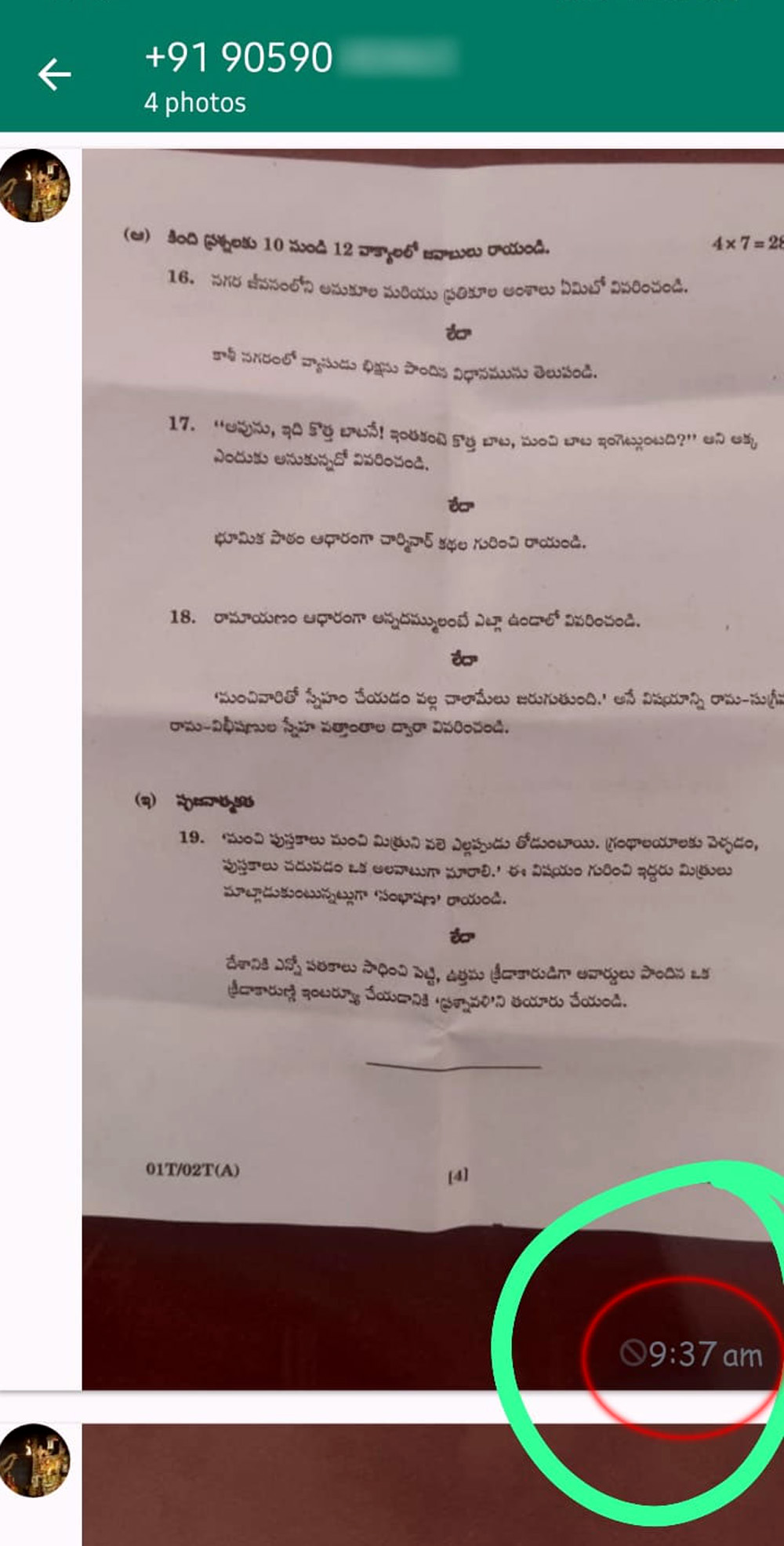 یہ تلگو زبان اول کا پرچہ دیکھے ہی دیکھتے واٹس ایپ پر گشت کرنے لگا مقامی عہدیداروں اور طلبہ میں سنسنی پیدا کردی ہے۔اطلاعات کے مطابق 9:30بجے صبح جونہی امتحانات کا آغاز ہوا9:37بجے صبح پرچہ سوال واٹس ایپ پر گردش کرنے لگا۔