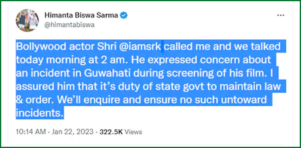 وہ گوہاٹی کے نارنگی ہال میں ہونے والی پٹھان کی اسکریننگ سے پریشان تھے۔ میں نے انہیں یقین دلایا کہ امن و امان برقرار رکھنا ریاستی حکومت کا فرض ہے۔ ہم اس بات کو یقینی بنائیں گے کہ فلم کی نمائش کے دوران کوئی تنازعہ نہ ہو۔